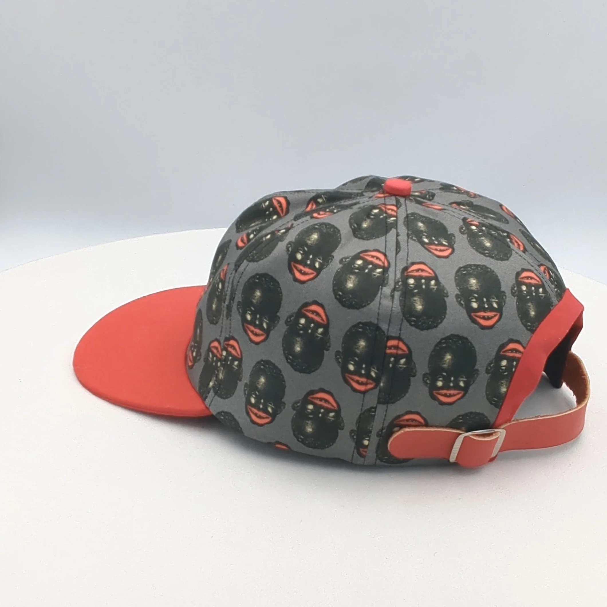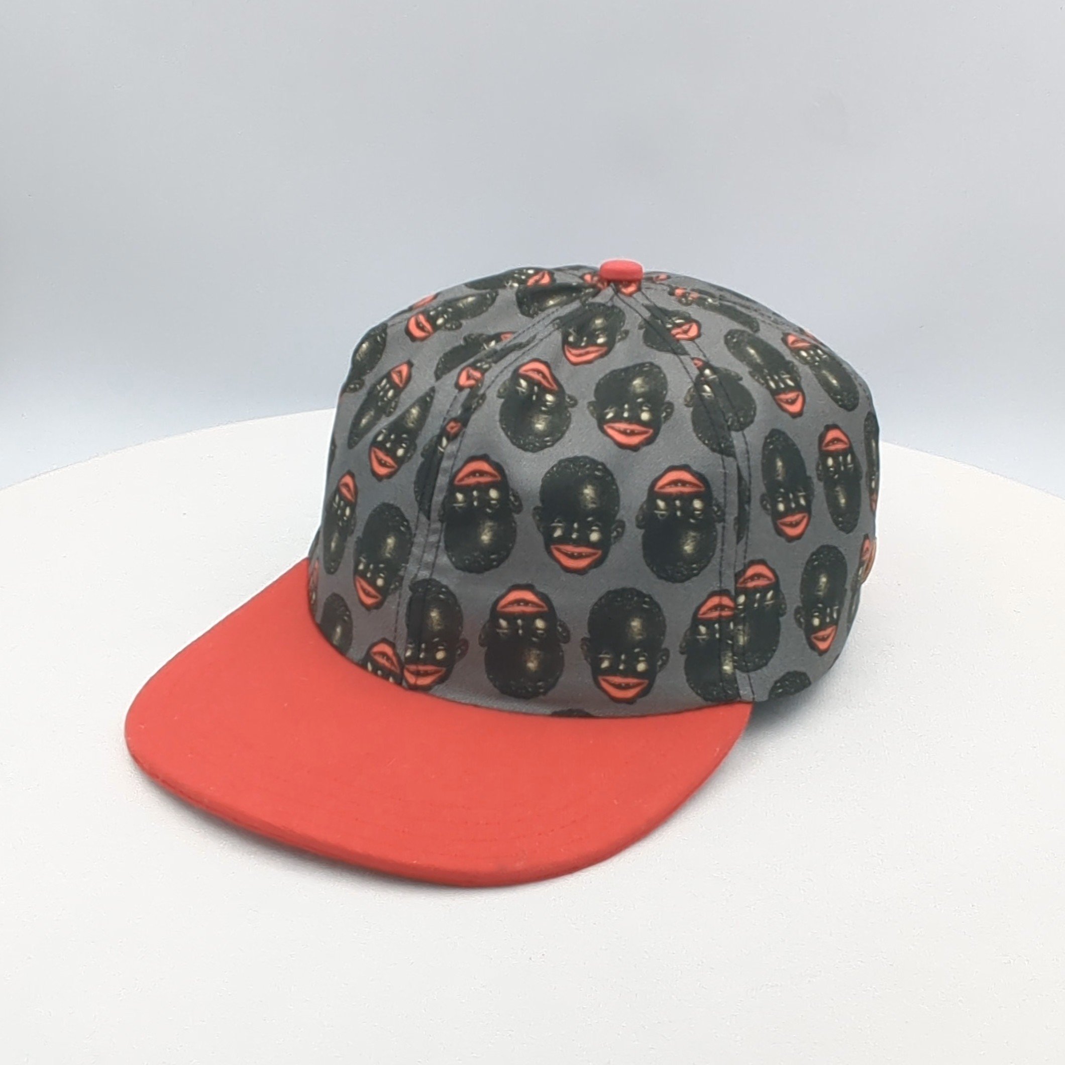 Sourced from the Pickaninny restaurant menu in the 1940s, the Pickaninnys hat is custom printed on silk twill, lined in red silk with a red brim, bias trim and top button, red leather strap and silver buckle.